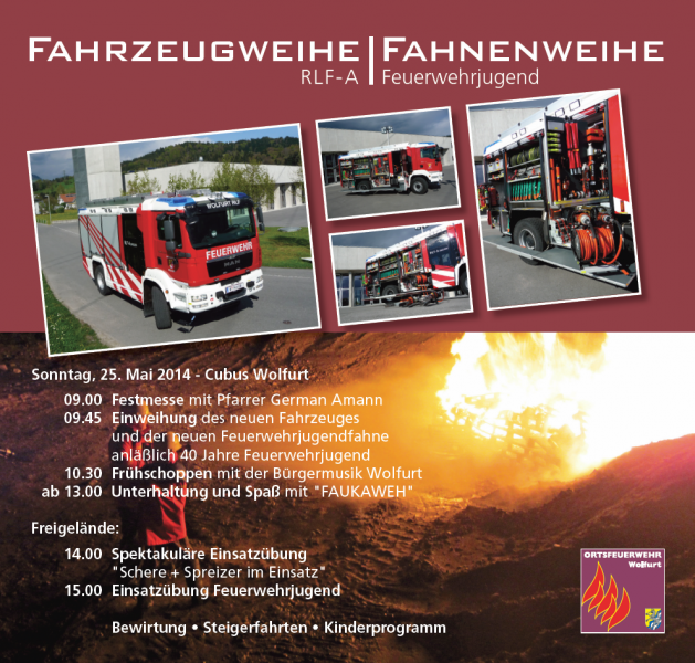 Am 25. Mai 2014 wurde das neue Rüstlöschfahrzeug (RLF) und die Fahne der Feuerwehrjugend feierlich eingewiehen und der künftigen Verwendung übergeben. Bei perfektem Wetter marschierten wir vom alten Feuerwehrhaus zum Cubus. Am Umzug nahmen über 200 Feuerwehrangehörige aus den umliegenden Gemeinden teil. Nach der Festmesse kam es zum besonderen Höhepunkt des Tages. Unser neues Fahrzeug und die neue Fahne der Feuerwehrjugend – sie feiert heuer ihr 40jähriges Jubiläum – wurden gewiehen. Bei der Fahnen- und Schlüsselübergabe wurde betont, dass wir mit dem RLF und der Fahne neue Verantwortungen zu übernehmen haben … sei es, Einsätze zu bewältigen, aber auch die Feuerwehrjugend und die gesamte Feuerwehr Wolfurt zu repräsentieren.
