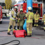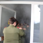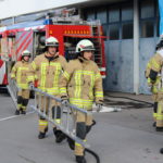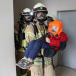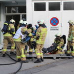 Der Steiger rettete die Personen, welche auf den Schlauchturm flüchteten mittels Rettungsschlauch. Die Atemschutztrupps vom TLF und LF gingen zur Brandbekämpfung und Personensuche im Gebäude vor.