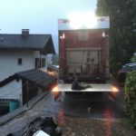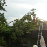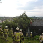 Heftige Windböen ließen in der Schloßgasse einen Baum umstürzen. Unglücklicherweise landete dieser auf dem danebenliegenden Haus. Beim Sturz auf dieses rissen die Äste ein großes Loch in die Dachhaut des Wohngebäudes. Mit Kettensägen und Seilen wurde der Baum vom Dach entfernt und in kleine Stücke zerlegt. Da kein Dachdecker erreicht werden konnte, schützten wir das Dach mit Planen und Sandsäcken vor dem nächtlichen Regenschauer, welcher jedoch viel zu früh eintraf und uns während des Einsatzes erwischte.