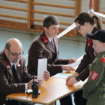 Nach dem wir die Stationen der Olympiade gemeistert hatten wurde es ernst. Es ging wieder zurück zur Schule in die Turnhalle, wo der Wissenstest abgehalten wurde. Hierbei gilt es verschiedene Fragen des Feuerwehrwesens zu beantworten. Es werden Fragen aus den Bereichen Organisation, Erste Hilfe, Brennen und Löschen, Kleinlöschgeräte usw. gestellt. Wir traten heuer in allen drei Kategorien an. Ein Jugendlicher in Bronze, vier in Silber und nochmals vier in Gold. Die Jugendlichen konnten alle den Test mit Bravour absolvieren.