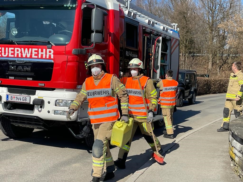 Bei einem Müllwagen kam es zu einem Defekt an der Hydraulikvorrichtung und dem dadurch verursachten Austritt von einer sehr großen Menge an Hydrauliköl. Die Verschmutzung auf der Straße wurde mittels Bindemittel gebunden und anschließend mit Wasser gereinigt.