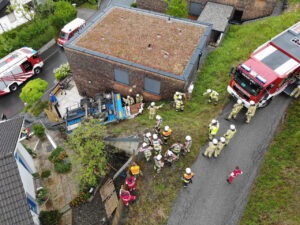 Vergangene Woche fand eine der ersten Übungen mit unserer neuen Hochleistungspumpe statt. Im Firmengelände der illwerke vkw durften wir unsere Pumpe, mit einer maximalen Förderleistung von 16.000 Liter pro Minute, voll ausfahren. Mit insgesamt drei parallelen Saugleitungen (Eingänge) mit einem Durchmesser von je 150 mm und vier Druckleitungen (Abgänge) mit dem selben Durchmesser, konnten wir verschiedene Szenarien testen. Aufgrund dieser Dimensionen benötigt der Aufbau der Pumpe, bis sie anlaufen kann, doch einiges an Zeit. Wenn jedoch die Pumpe dann läuft, überzeugt sie mit einer hohen Leistung, einfacher Bedienung und geräuscharmen Betrieb.