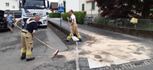 Im Bereich der Rickenbacher Kapelle hat ein Transporter, ausgelöst durch eine Notbremsung, mehrere Liter Frittierfett auf einer Länge von 200 Metern verloren. Wir haben das Fett mit Ölbindemittel und Bioversal gebunden. Eine Kehrmaschine hat anschließend die Straße gereinigt. Die Reinigung hat über zwei Stunden gedauert, da sich das Fett nur schwer entfernen ließ.