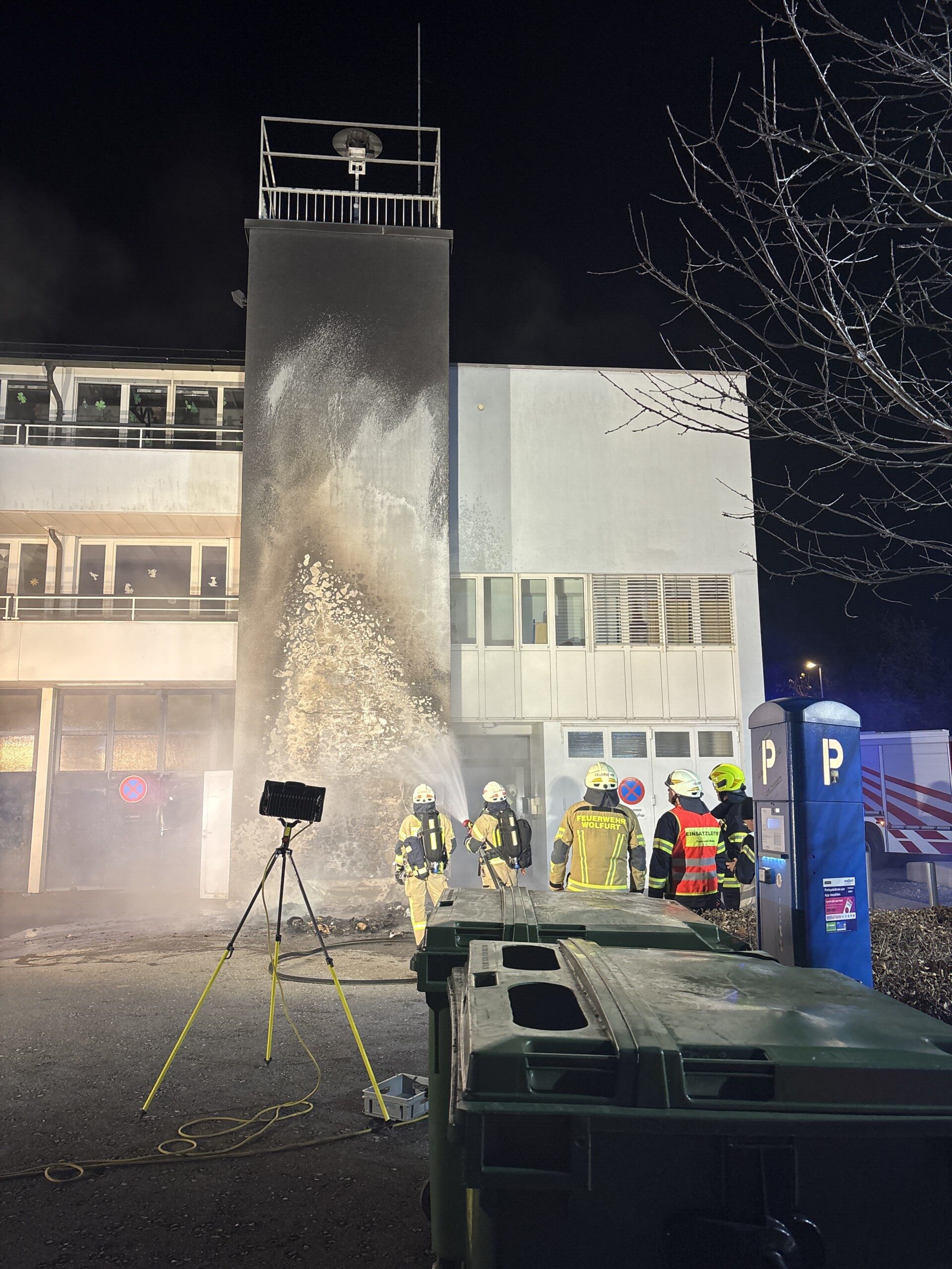Zusätzlich wurde der Steiger in Stellung gebracht, um den Schlauchturm beziehungsweise die Fassade gründlich kontrollieren zu können.