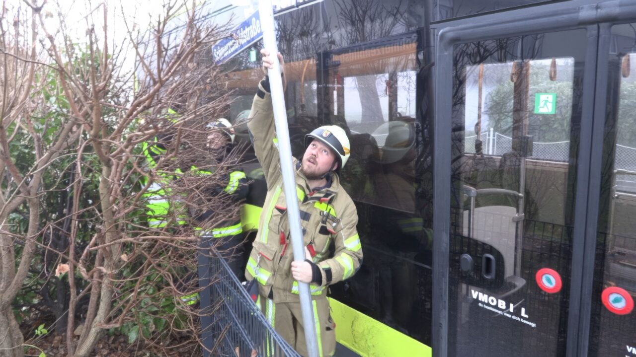 Am heutigen Vormittag wurden wir zu einem Verkehrsunfall in die Schmerzenbildstraße alarmiert. Ein Gelenkbus kollidierte beim Abbiegen in die Wälderstraße mit einem Gartenzaun sowie einem Verkehrsschild und verkeilte sich dabei.