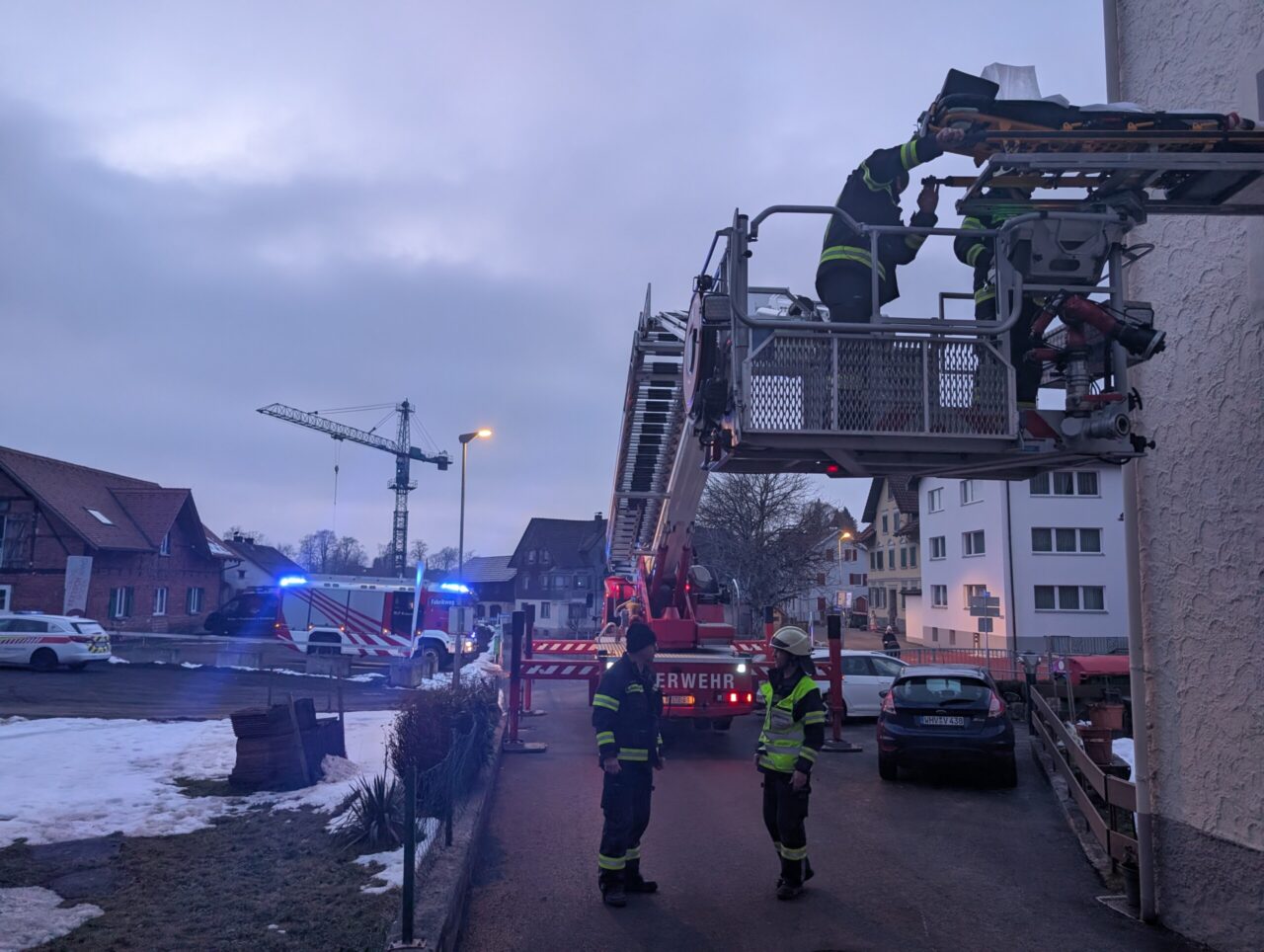 Um die betroffene Person möglichst schonend aus dem ersten Obergeschoss zu transportieren, wurde sie mithilfe des Steigers über ein Fenster geborgen und anschließend der Rettung übergeben.