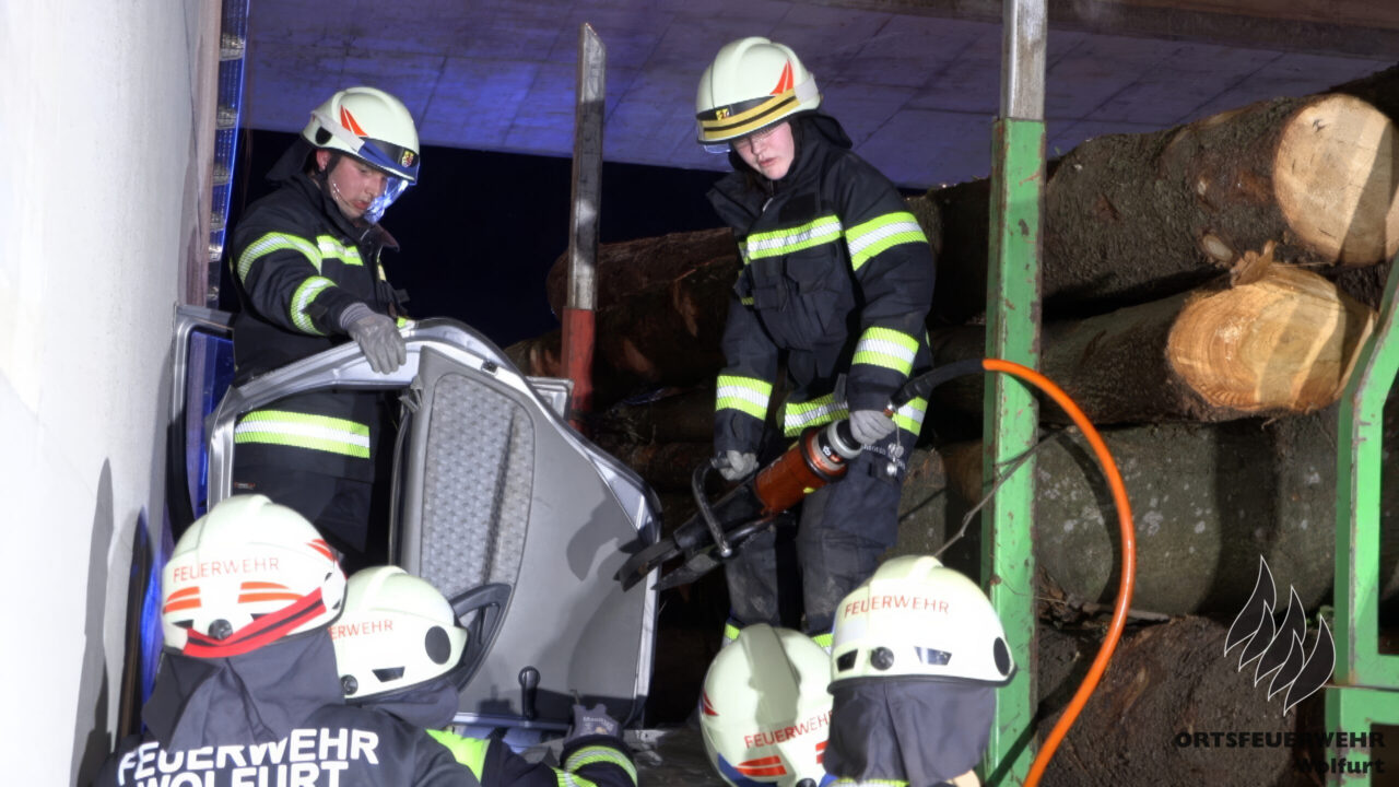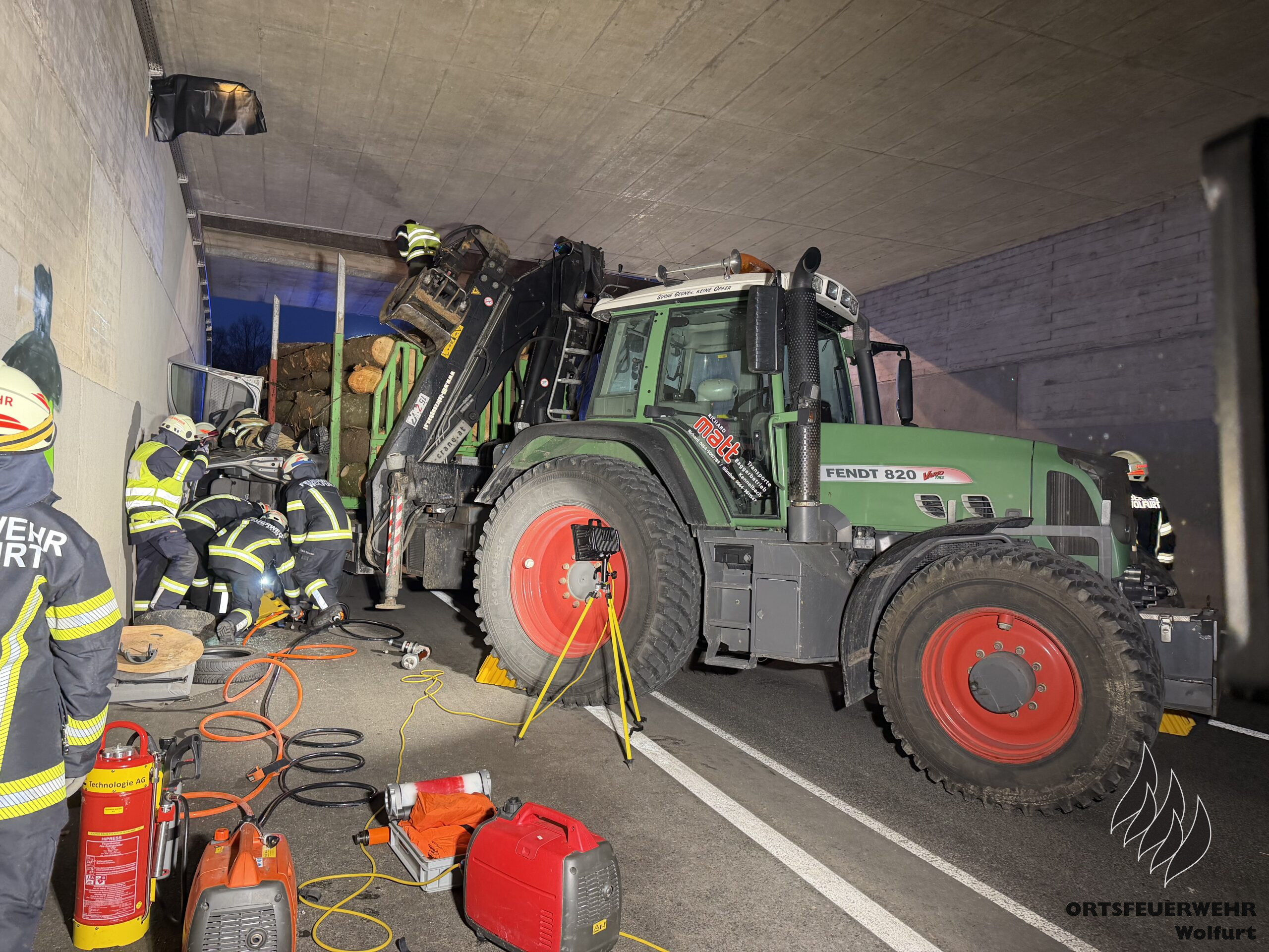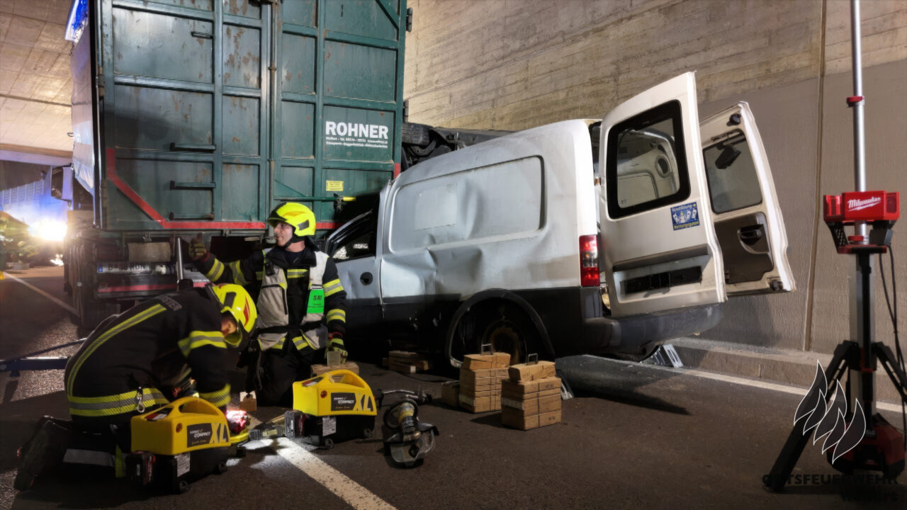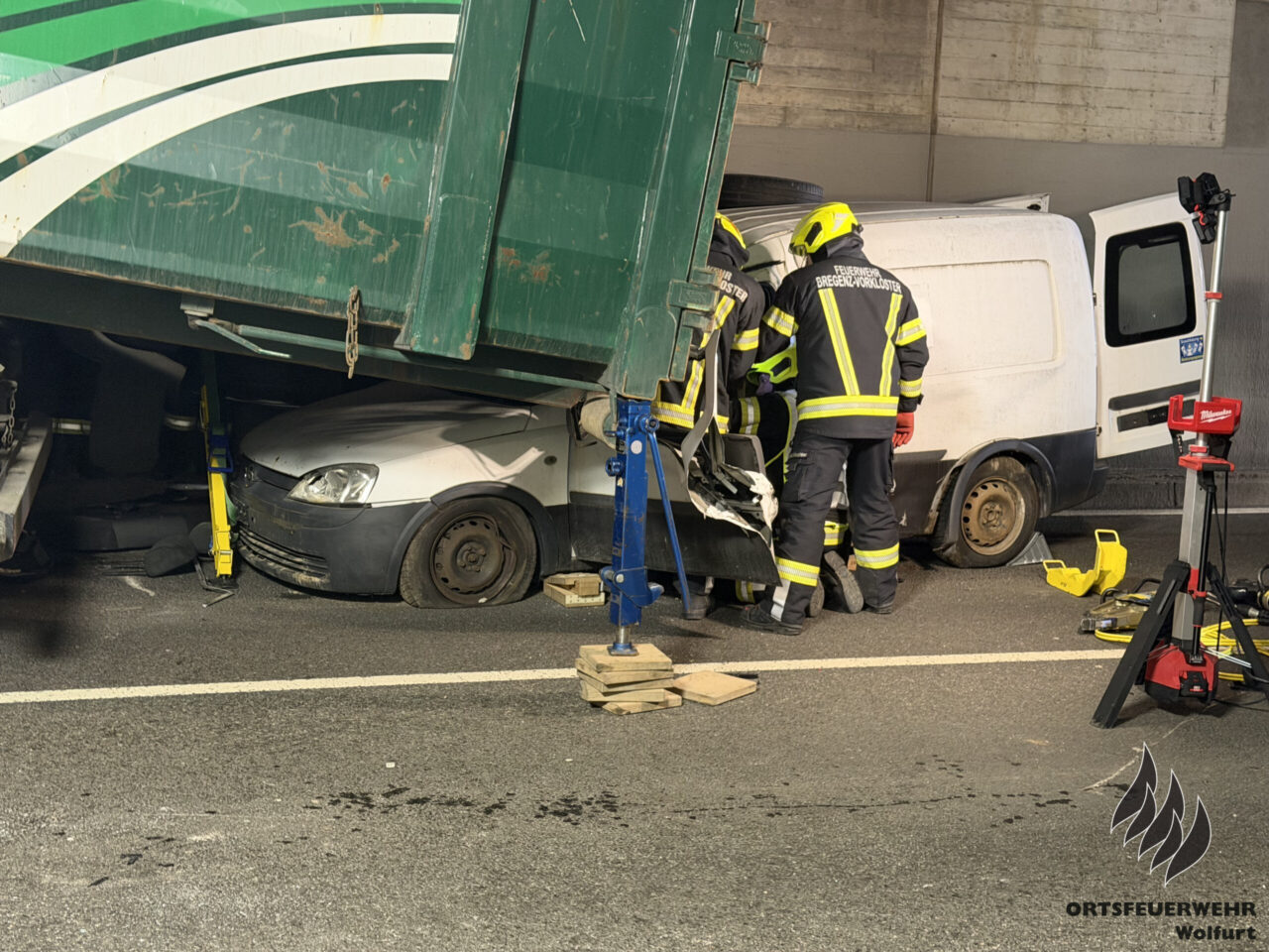 Die Feuerwehr Wolfurt führte am Dienstag ihre erste Vollübung des Jahres durch. Das Szenario war anspruchsvoll: Ein komplexer Verkehrsunfall mit mehreren eingeklemmten Personen in der Bahnunterführung auf der L41 Senderstraße. Das Unfallszenario umfasste vier Pkw – darunter ein Fahrzeug mit einem umgekippten Wohnwagen – einen Traktor mit Anhänger, einen Lastkraftwagen, einen weiteren Traktor, einen Radlader und einen Fahrradfahrer.