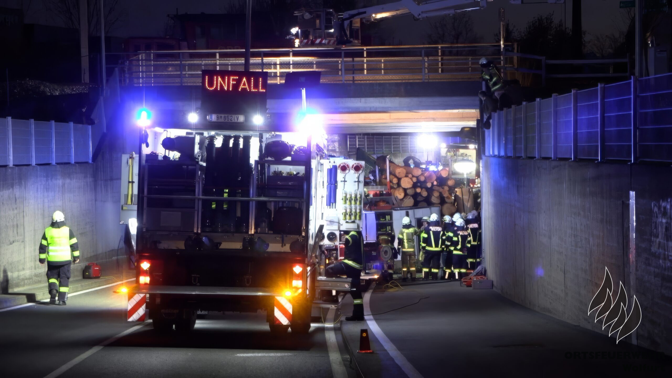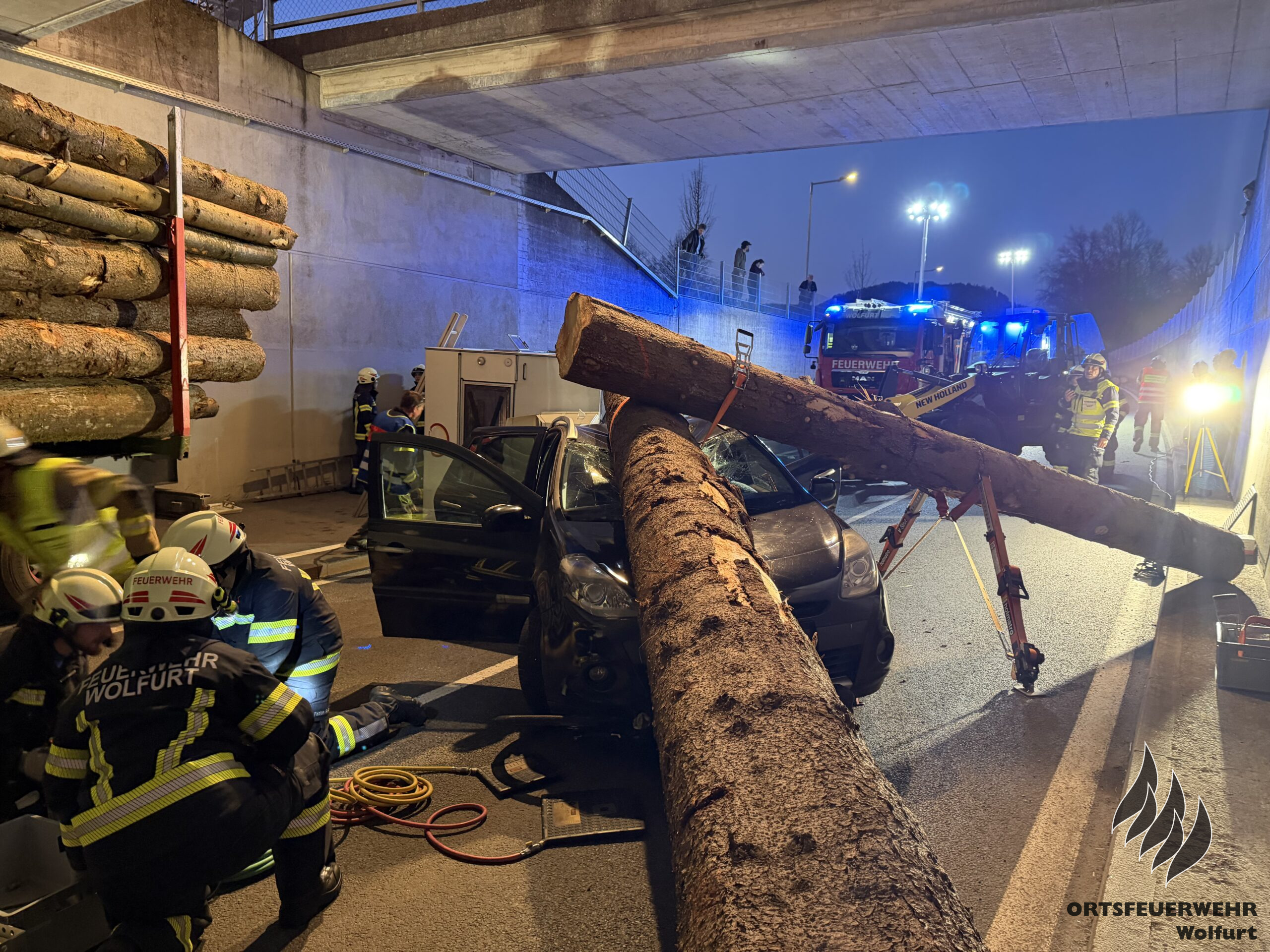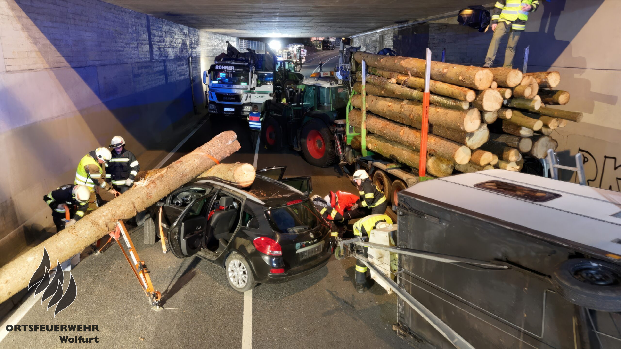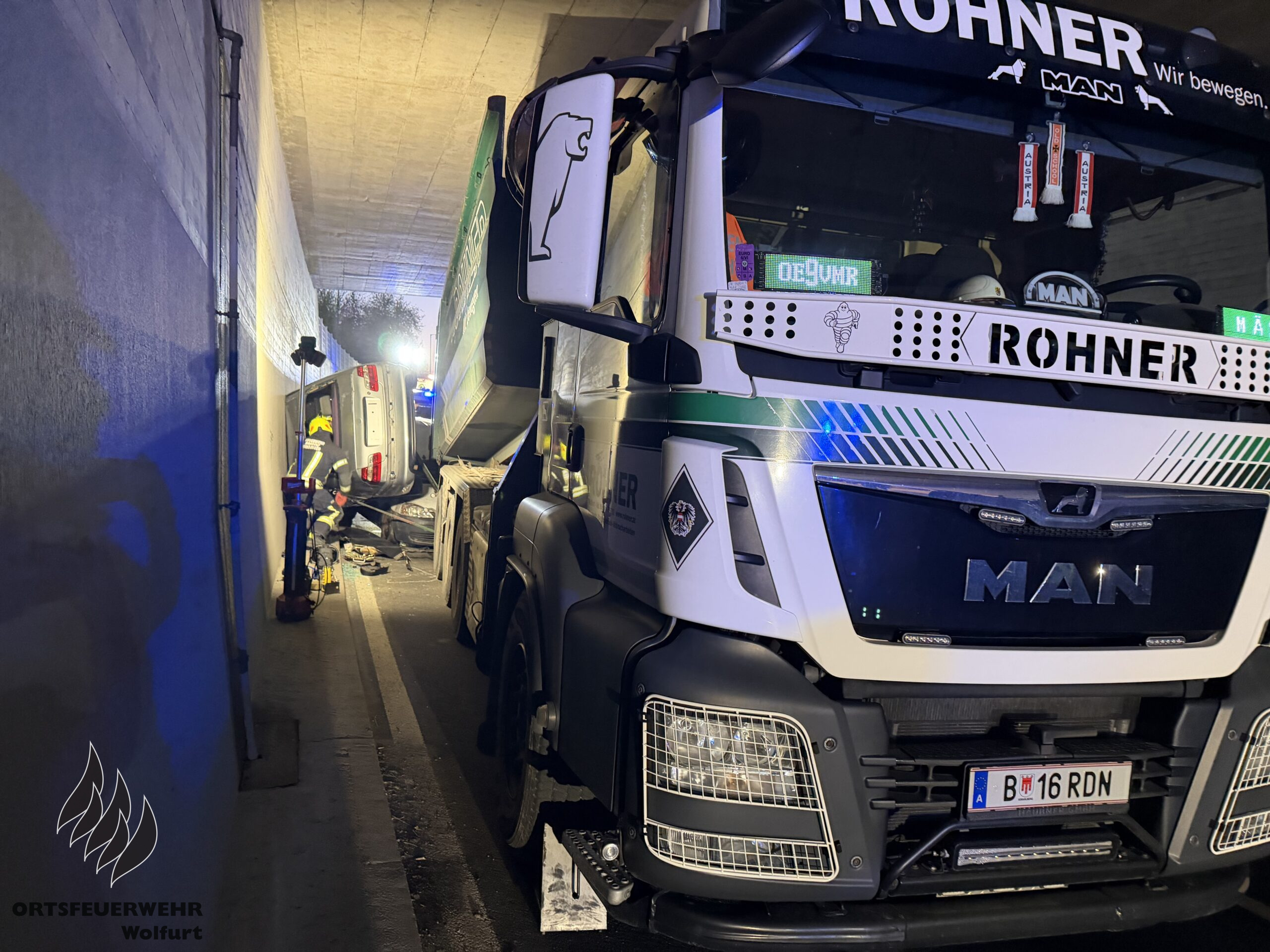 Die Feuerwehr Wolfurt führte am Dienstag ihre erste Vollübung des Jahres durch. Das Szenario war anspruchsvoll: Ein komplexer Verkehrsunfall mit mehreren eingeklemmten Personen in der Bahnunterführung auf der L41 Senderstraße. Das Unfallszenario umfasste vier Pkw – darunter ein Fahrzeug mit einem umgekippten Wohnwagen – einen Traktor mit Anhänger, einen Lastkraftwagen, einen weiteren Traktor, einen Radlader und einen Fahrradfahrer.