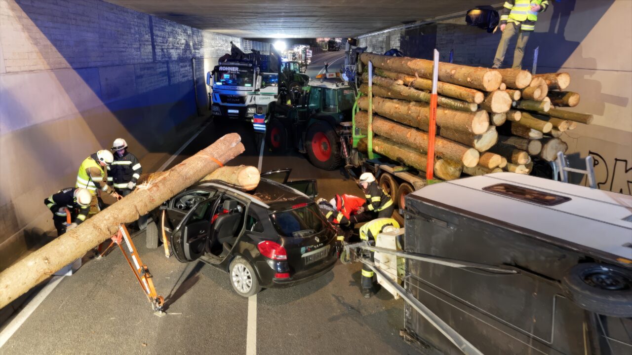 Die Feuerwehr Wolfurt führte am Dienstag ihre erste Vollübung des Jahres durch. Das Szenario war anspruchsvoll: Ein komplexer Verkehrsunfall mit mehreren eingeklemmten Personen in der Bahnunterführung auf der L41 Senderstraße. Das Unfallszenario umfasste vier Pkw – darunter ein Fahrzeug mit einem umgekippten Wohnwagen – einen Traktor mit Anhänger, einen Lastkraftwagen, einen weiteren Traktor, einen Radlader und einen Fahrradfahrer.