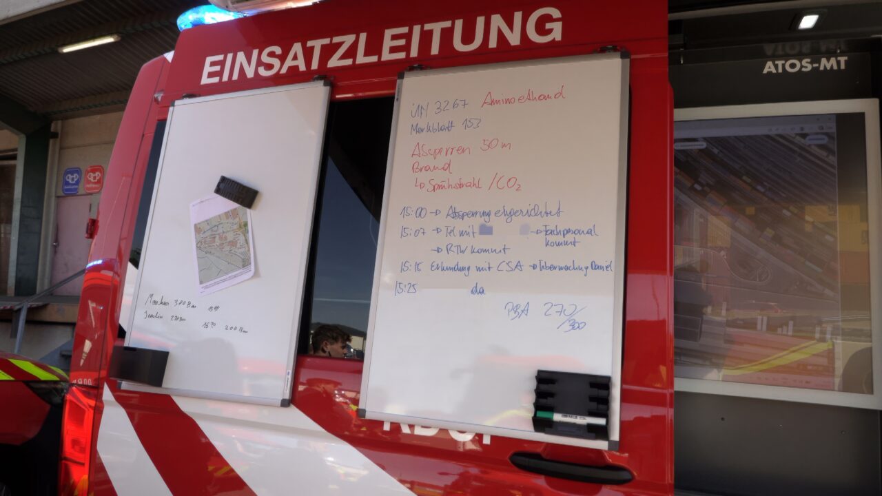 Beim Eintreffen konnte eine leichte Verunreinigung durch eine ausgetretene Flüssigkeit festgestellt werden. Entsprechend der Erstmeldung wurde der Einsatz unter Anwendung der geltenden Gefahrgutrichtlinien abgearbeitet. Der betroffene Bereich wurde abgesichert und weitere Erkundungsmaßnahmen eingeleitet.