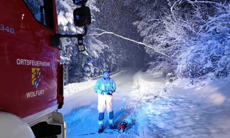 Durch die Schneelast stürzte ein Baum auf der Bucherstraße um und blockierte dabei die Fahrbahn für den nachfolgenden Verkehr. Ein…
