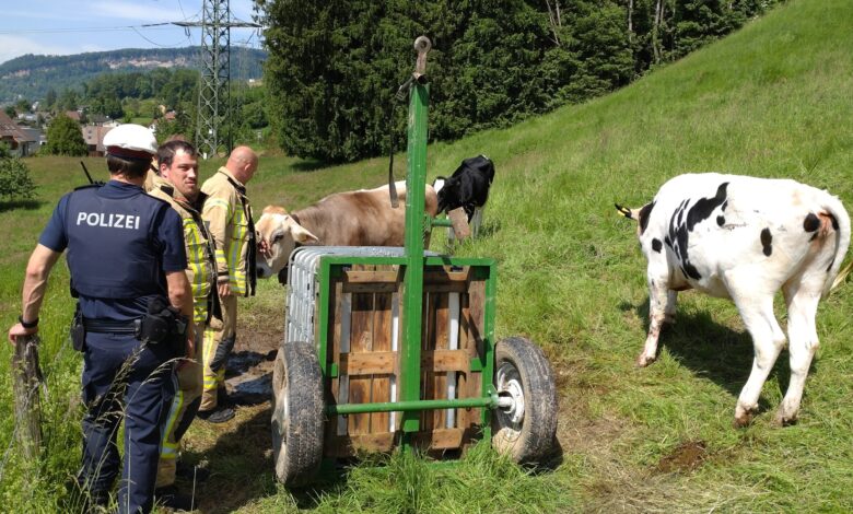 Ein Rind verhedderte sich mit ihrem Schellenband an der Anhängerdeichsel einer Viehtränke. Bei unserem eintreffen hatte sich bereits das Schellenband…