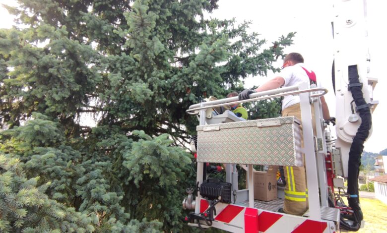 Die Entfernung eines geschwärmten Bienenvolks in der Krone eines hohen Baumes erforderte die Unterstützung der Feuerwehr mittels Steiger. Der Imker…
